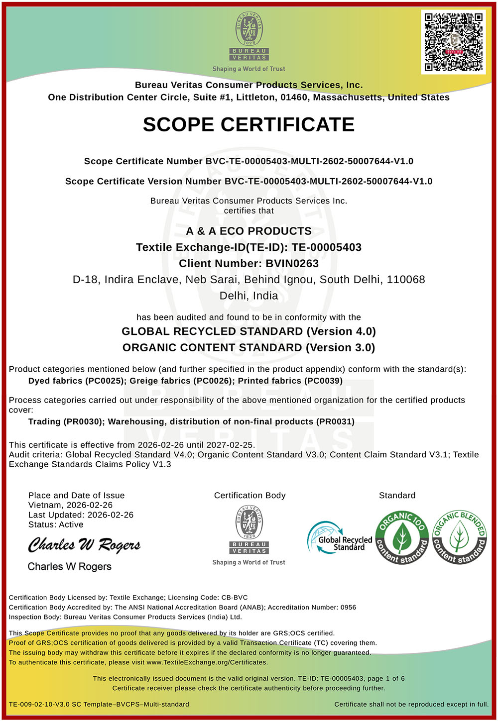 A&A Eco Products is a sustainable textile company that sells certified organic and recycled fabrics,apparel and furnishing based in New Delhi,India. We have a proven history of providing best in class sustainable and ethical textile products to global brands.